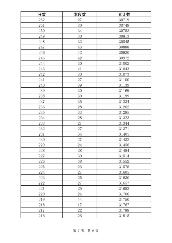 全市一分一段表