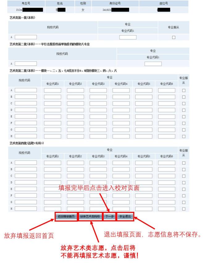 “放弃艺术类院校”按钮:放弃艺术类院校志愿,不填报艺术类的院校。一旦放弃,考生将不能再次填报该类院校录取,请慎重操作。