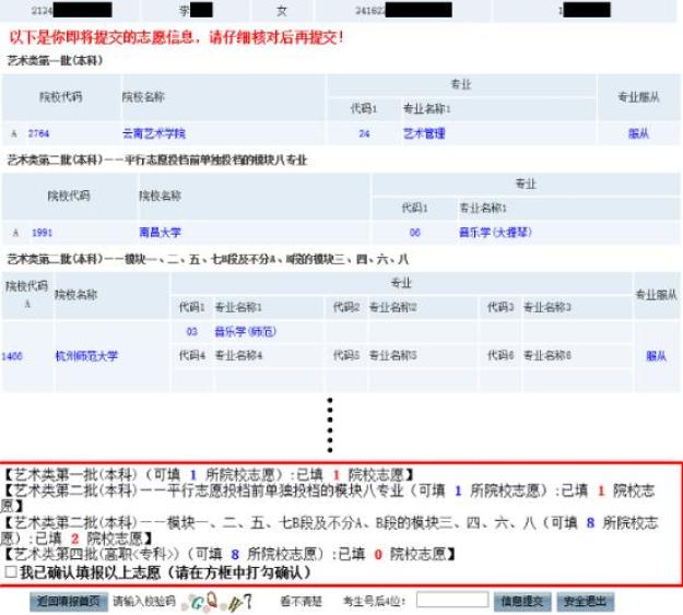 请考生务必再次仔细核对自己的信息,确认无误后输入校验码并点击“信息提交”按钮提交志愿信息,信息一旦提交将无法重填或修改,请慎重操作。