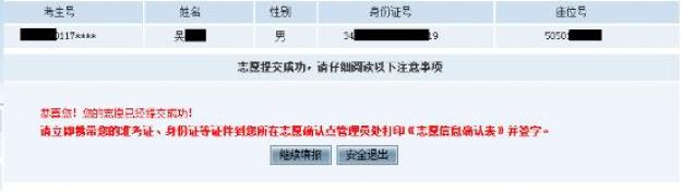 信息提交成功后将看到下面的页面,如果下面的页面没有出现,可能您的志愿没有填报成功,请到志愿填报点老师处咨询。