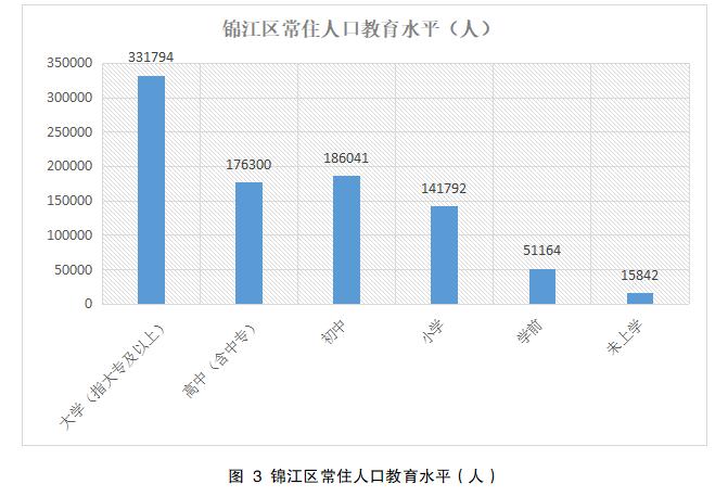 锦江区常住人口中,拥有大学(指大专及以上)文化程度的人口为331794人,占所有常住人口的比重达到36.75%,比2010年第六次全国人口普查(31.28%)提高了5.5个百分点。每10万人中拥有大学文化程度的人口由2010年的31284人增至36746人,比成都市平均水平(25582人)多11164 人。
