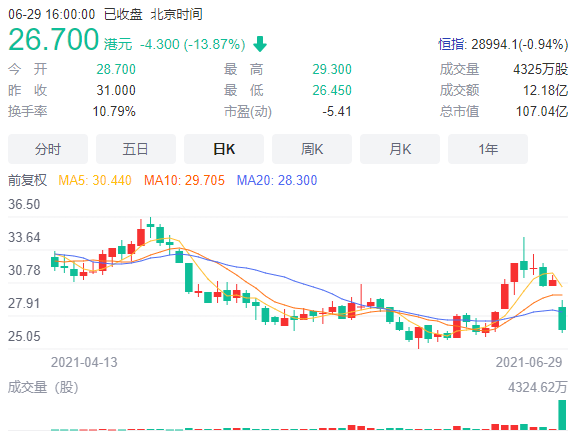 6月29日,在港上市的药明巨诺股价出现暴跌,截至收盘时,报26.7港元,跌幅13.87%,最新市值107亿港元。