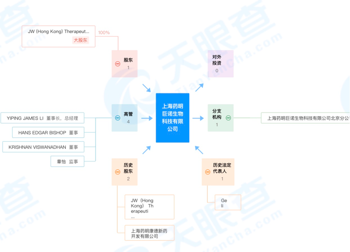 据天眼查显示,药明巨诺现任大股东为JW(Hong Kong)Therapeutics,该公司为药明康德众多的联营企业之一。目前,药明康德董事长李革已经显示为历史法定代表人,但是美国巨诺的CEO汉斯•毕绍(Hans Bishop)依然在药明巨诺担任董事。