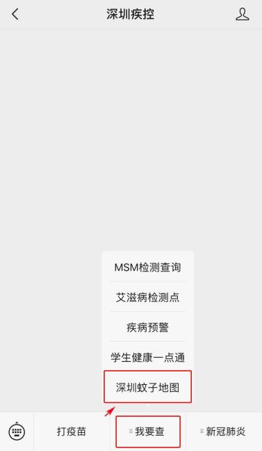关注“深圳疾控”微信公众号,点击菜单栏“我要查询”-“蚊子地图”。
