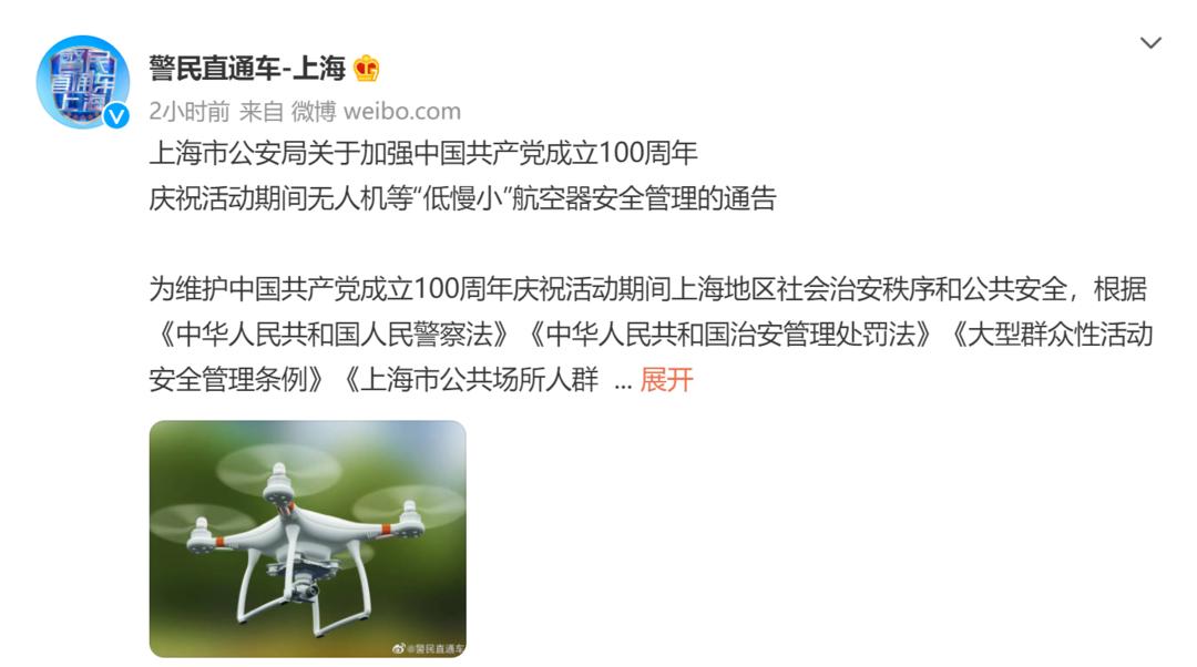 上海市公安局官方微博“警民直通车-上海”今天发布《上海市公安局关于加强中国共产党成立100周年庆祝活动期间无人机等“低慢小”航空器安全管理的通告》。