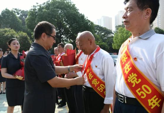 在“光荣在党50年”纪念章发放仪式上,秦德平院长为老党员代表逐一颁发“光荣在党50年”纪念章,感谢他们数十年如一日为党和南阳法院事业作出的积极贡献。仪式上,老党员们心潮澎湃,感到无比喜悦,他们表示,会珍惜这份无上的荣光,退休不褪色,为党的事业奋斗终身。