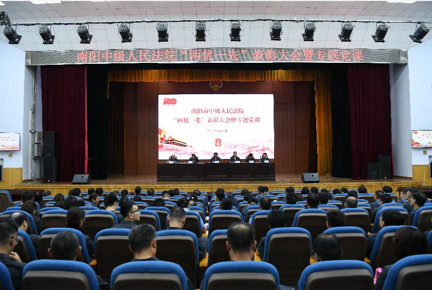 重温入党誓词后,南阳中院组织全院干警在第一审判庭举行庆祝建党100周年“两优一先”表彰大会,动员全院干警进一步坚定信念、振奋精神、凝聚力量,表彰大会由南阳中院党组副书记、常务副院长李迎胜主持。