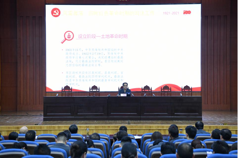 为扎实推进党史学习教育,表彰大会后,秦德平院长以《赓续红色基因 推进法治建设》为题,为全院干警讲授了一堂主题鲜明、意义深刻的专题党课。