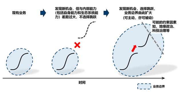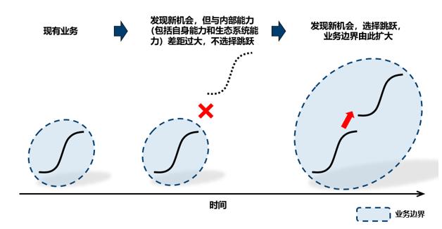 企业如果选择跳跃,从原有业务跳到新的业务,那么其边界就会发生改变;如果企业选择多次跳跃,则其业务边界就会随之不断延伸。