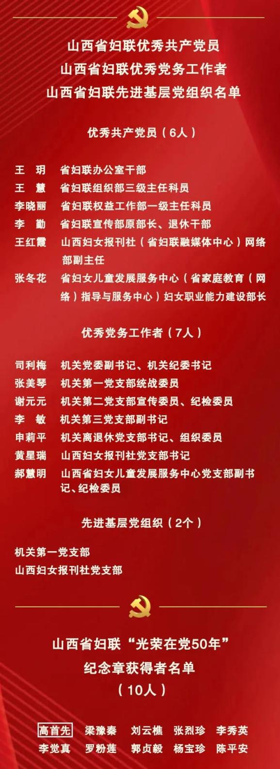 原标题:《山西省妇联举行“两优一先”表彰大会暨“光荣在党50年”纪念章颁发仪式》