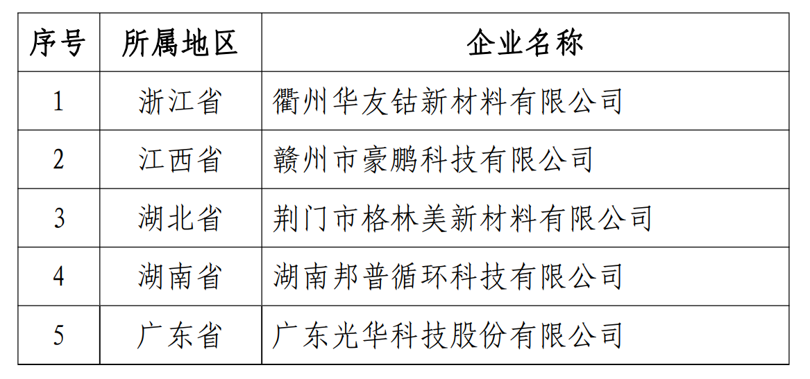 早在2018年9月,工信部就发布了符合《新能源汽车废旧动力蓄电池综合利用行业规范条件》企业名单(第一批),格林美(002340)全资子公司荆门市格林美新材料有限公司等5家企业入选,具体如下: