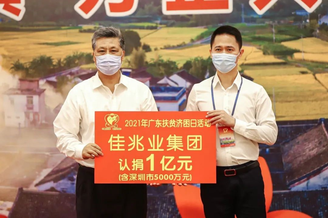 2021年是中国共产党建党100周年,是“十四五”规划开局之年,也是推进巩固拓展脱贫攻坚成果及乡村振兴有效衔接的起步之年。为贯彻落实党中央、国务院和省委、省政府的工作部署,6月30日,2021年“广东省扶贫济困日活动”举行,佳兆业集团再度捐款1.2亿元人民币,用于巩固脱贫成果、助力乡村振兴。其中在广东省和深圳市活动现场各认捐5000万,揭阳市活动现场认捐2000万。在2017年“万企帮万村”号召下,佳兆业集团率先投身乡村振兴,5年间已累计投入5.93亿元,是参与最早、投入最大的广东企业之一。