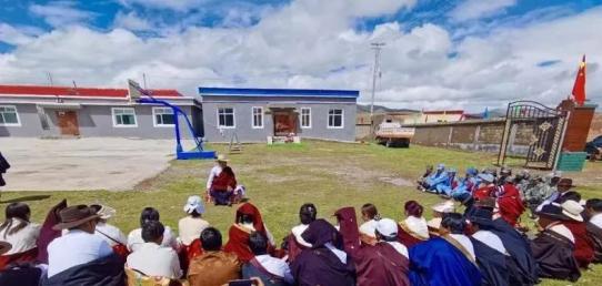 132名党员干部在镇党委书记苏海宁同志带领下面向党旗,重温入党誓词,与58年前形成跨时代的对话。宣誓结束后,大家在草地上席地而坐,双目都全神贯注地注视着主席台。课上,巴角同志指了指胸前佩戴的党徽,慈祥地说道:“我记得那是1977年刚进格前村‘两委’工作,那时候基层工作非常艰苦,雪灾频发,因为危险大、任务重,冲一线、救灾民也就成为共产党员的特权。每当雪灾发生,村上所有党员都义无反顾骑着自家的马和牦牛,到受灾群众家里送粮送煤,有时候天气恶劣无法前行就得在无人区搭帐篷过夜。对我印象最深刻一次是,当救援队到了一家牧户,那户的老阿妈看见队伍就像见了自己亲人一样,连忙跑来迎接,从那刻就觉得一颗小小党徽原来是那么耀眼与荣耀,到了1993年我终于如愿以偿加入了共产党,那一天对于我来说真的太深刻了”。