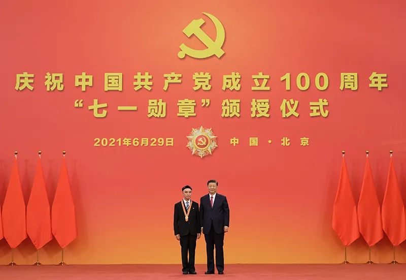 6月29日,庆祝中国共产党成立100周年“七一勋章”颁授仪式在北京人民大会堂金色大厅隆重举行。中共中央总书记、国家主席、中央军委主席习近平向“七一勋章”获得者买买提江·吾买尔颁授勋章。新华社记者 李学仁 摄
