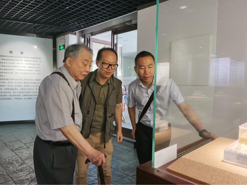 ▲曹文宣院士和社湖北省委宣传部副部长王博(右)为摄制组导演邱炜(中)介绍水生生物博物馆