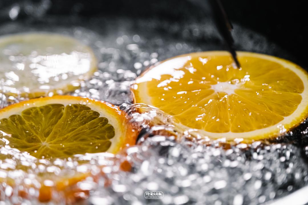橙子切 5mm 厚的薄片,在 1:1 的糖水中小火煮30分钟