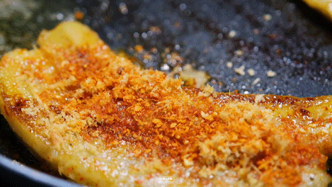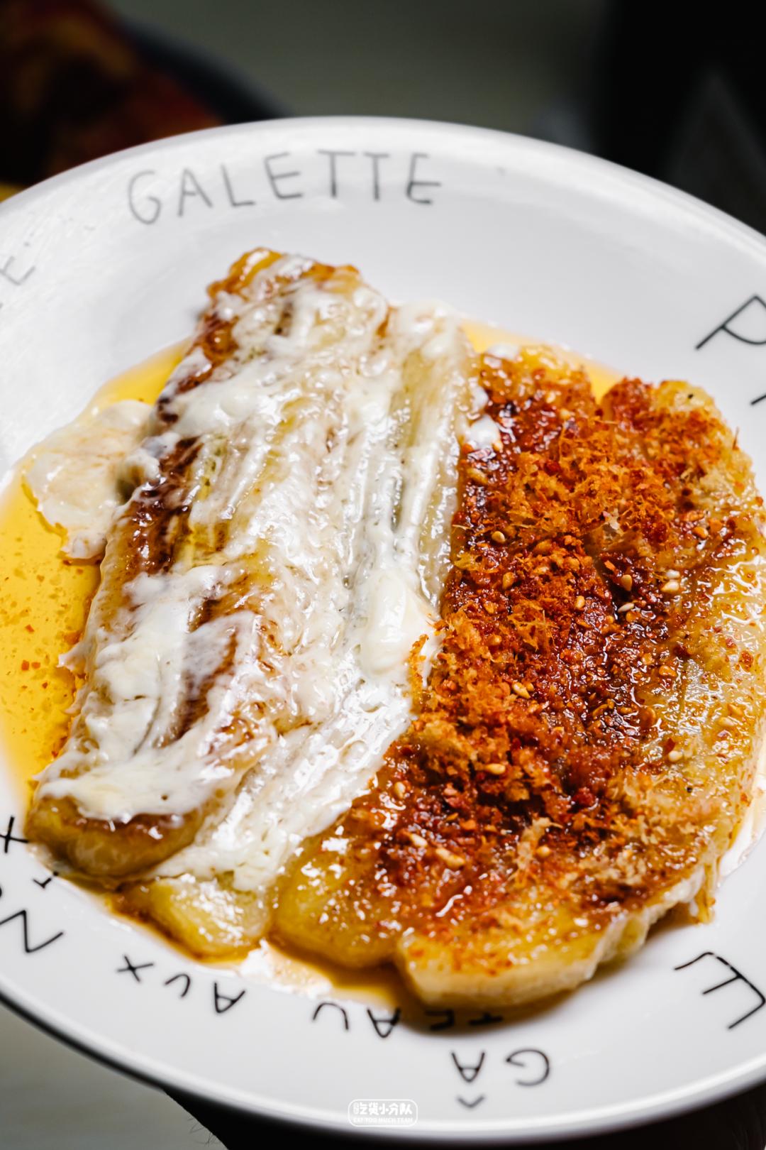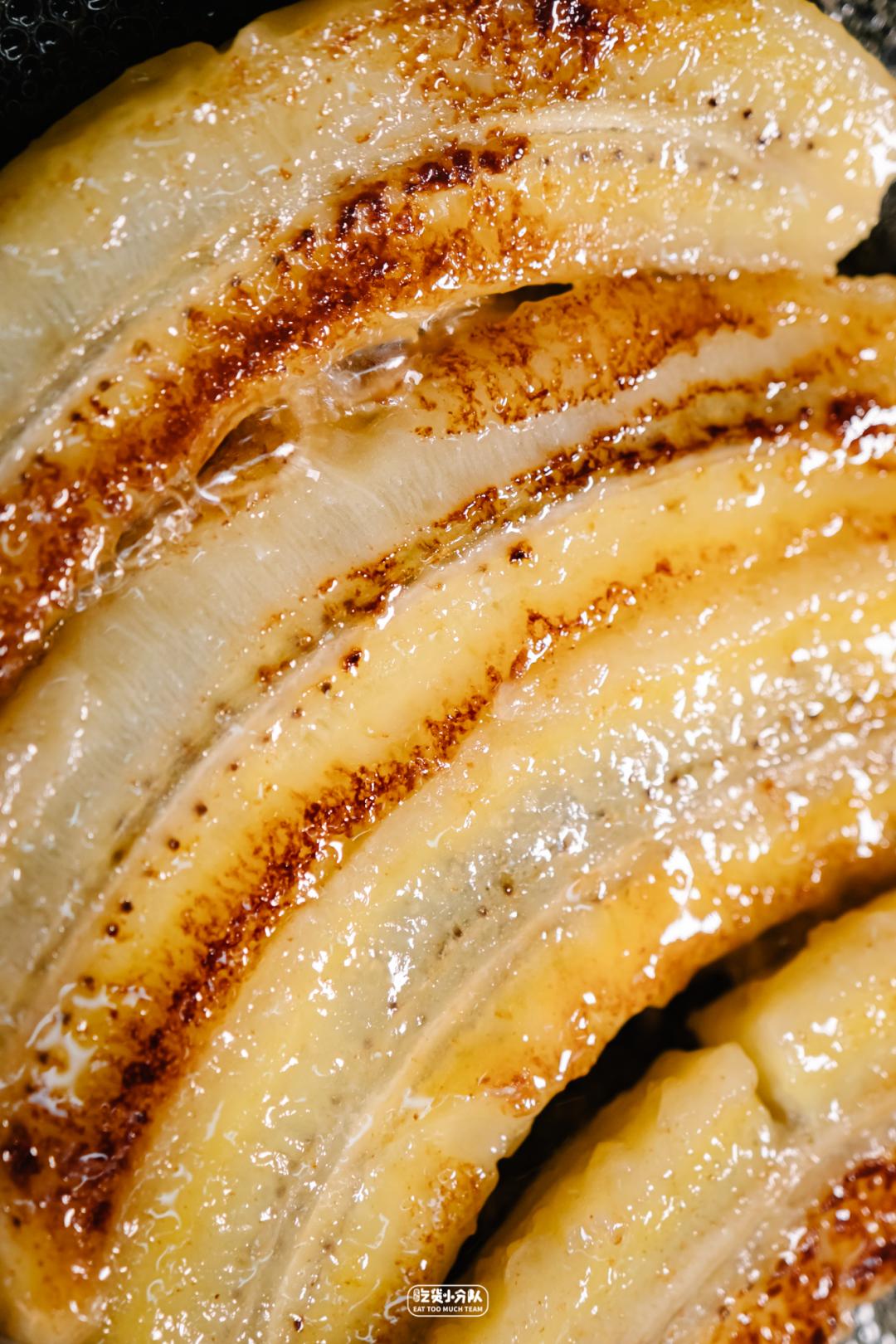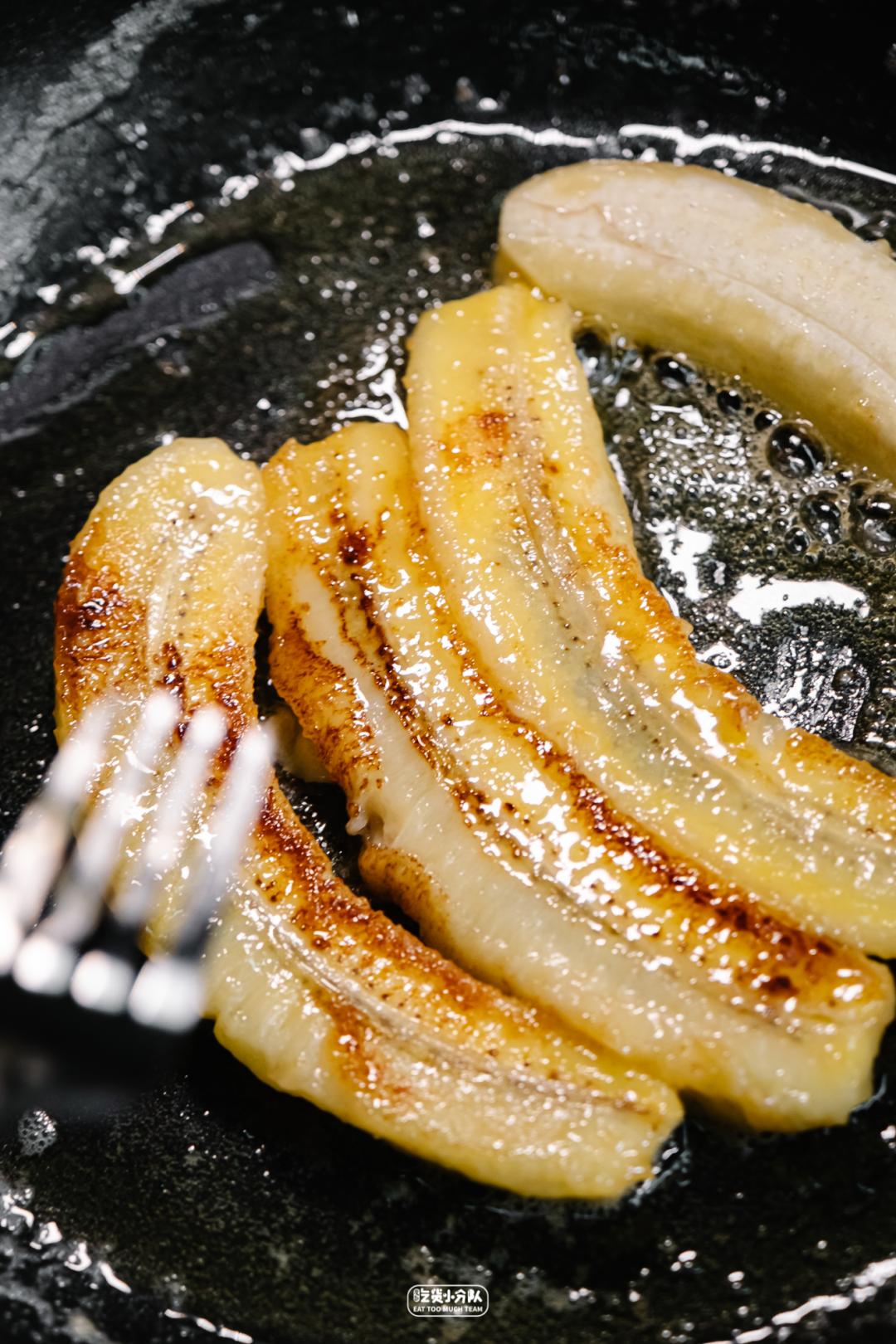 滚滚子学人精上线,还搞出了双味版:小火用黄油将香蕉煎上色,一份撒辣椒粉和南姜末,剩下一份撒白砂糖,抹上奶油芝士,待香蕉变得香软盛出,没想到竟出奇的好吃。