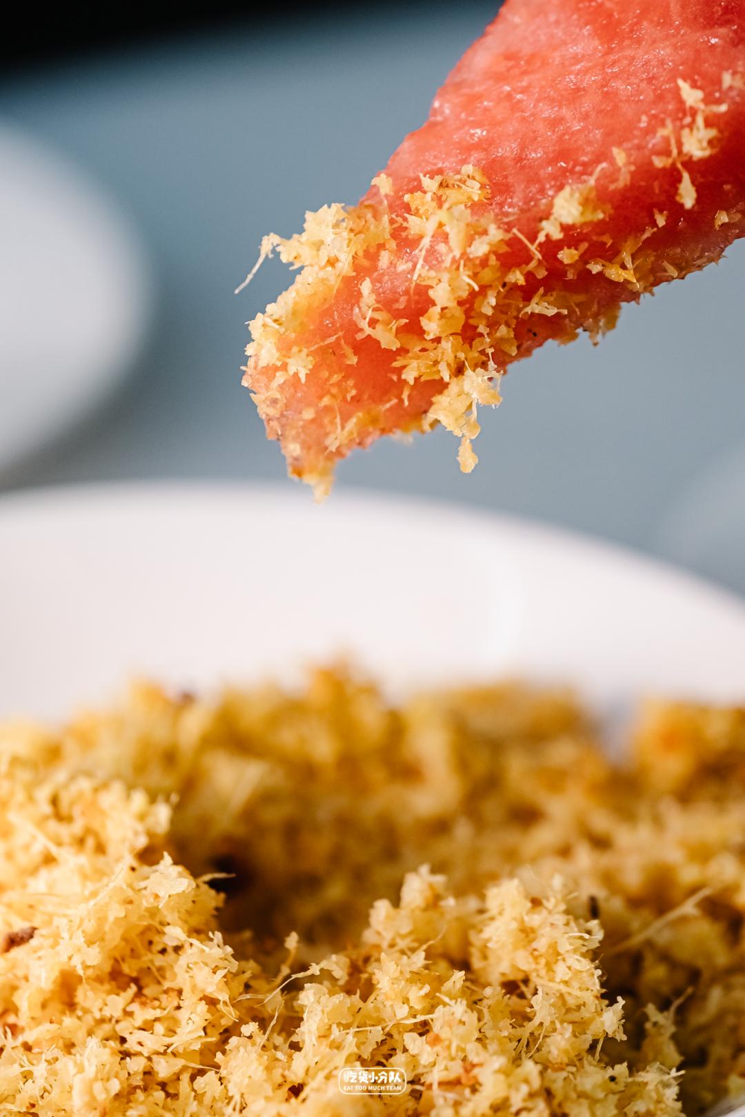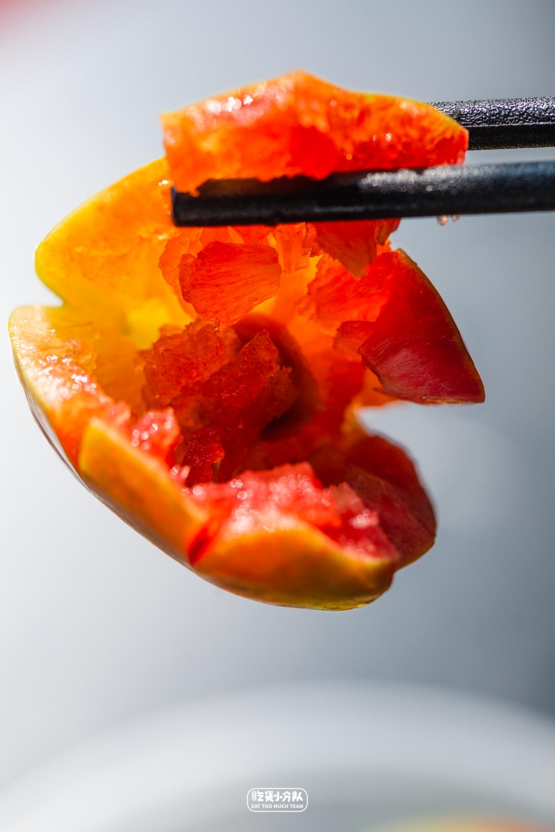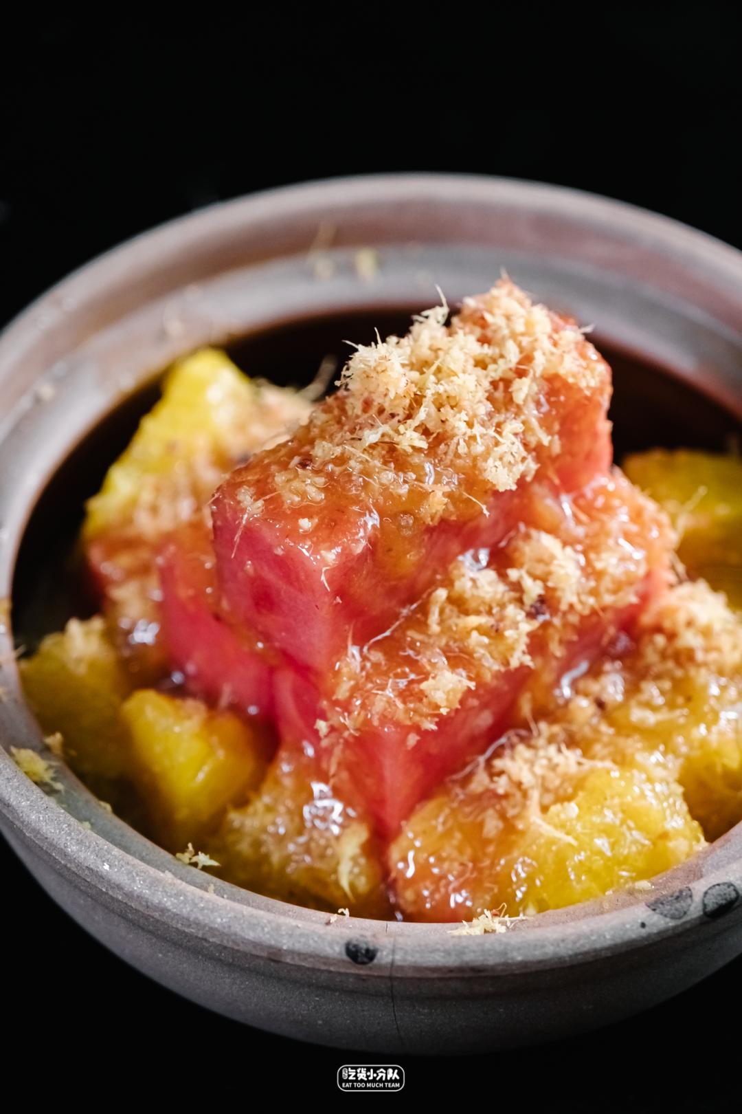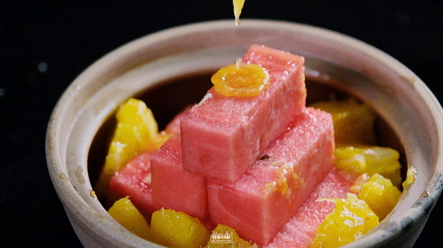 西瓜啫啫煲,听名字“孟婆”都直呼内行,没想到味道却很好。滚子独创,用西瓜和埃及橙做,橙子一半鲜榨做酱汁,一半切块;橙汁煮沸,加花椒粉和柠檬汁收汁,撒盐调味,在砂锅中码放好西瓜淋酱汁,最后撒上南姜末和酸梅粉。
