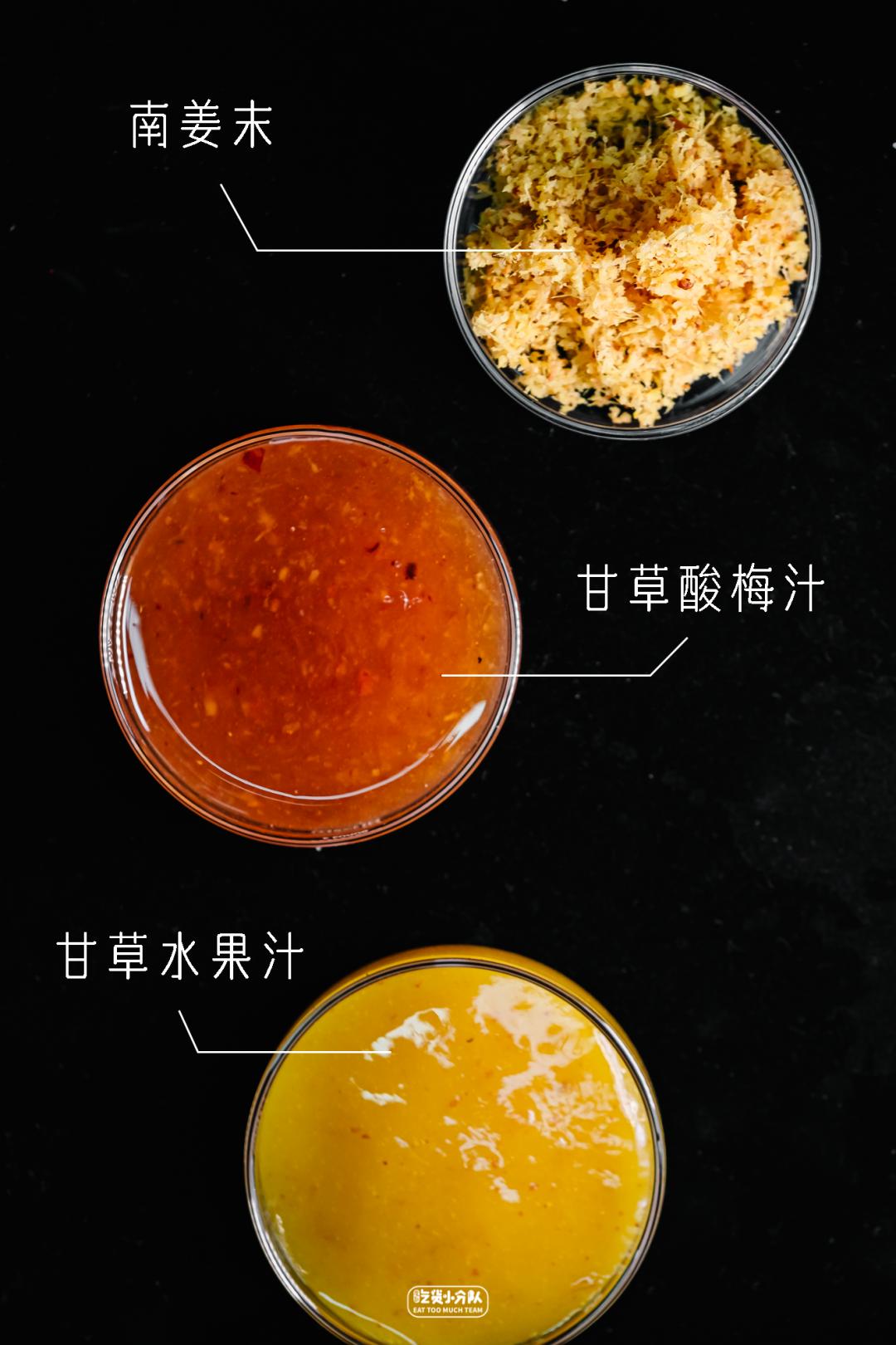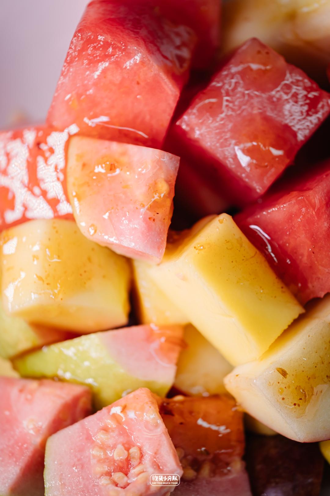 高度浓缩的甘草水果汁和甘草酸梅汁,只需加一点点矿泉水稀释,拌入水果块中,再撒上潮汕菜系的灵魂——南姜末,就是当地的独特吃法。
