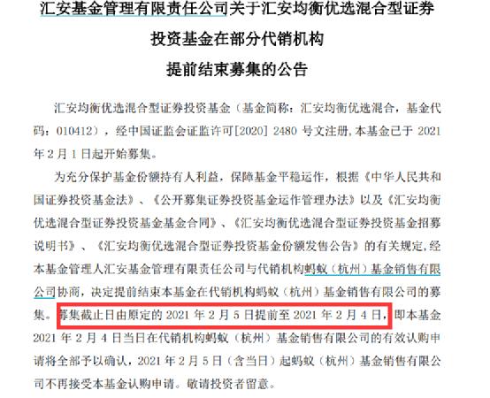 而且该基金系提前结束募集,原计划募集期限为2月1日至2月5日,之后汇安基金将该产品在部分代销机构的募集截止日提前至2月4日。