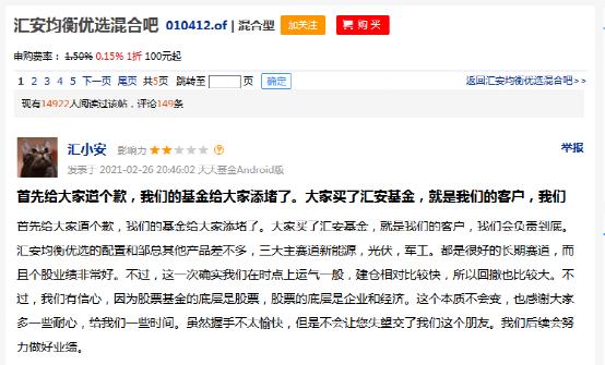 2月26日,汇安基金旗下名为“汇小安”的账号于在基金社区发帖称:“抱歉,给您添堵了,我们会把业绩努力做好。邹总从业20年,13年的基金经理,曾是著名的明星经理,我们会努力,请大家继续监督。”
