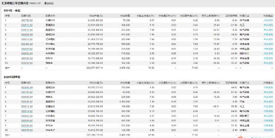 对比2020年第四季度末汇安裕阳定开混合和汇安行业龙头混合的十大重仓股,前九名都是通威股份、宁德时代、璞泰来、富奥股份、恩捷股份、亿纬锂能、中航高科、东方财富、菲利华,只有第十名不同。