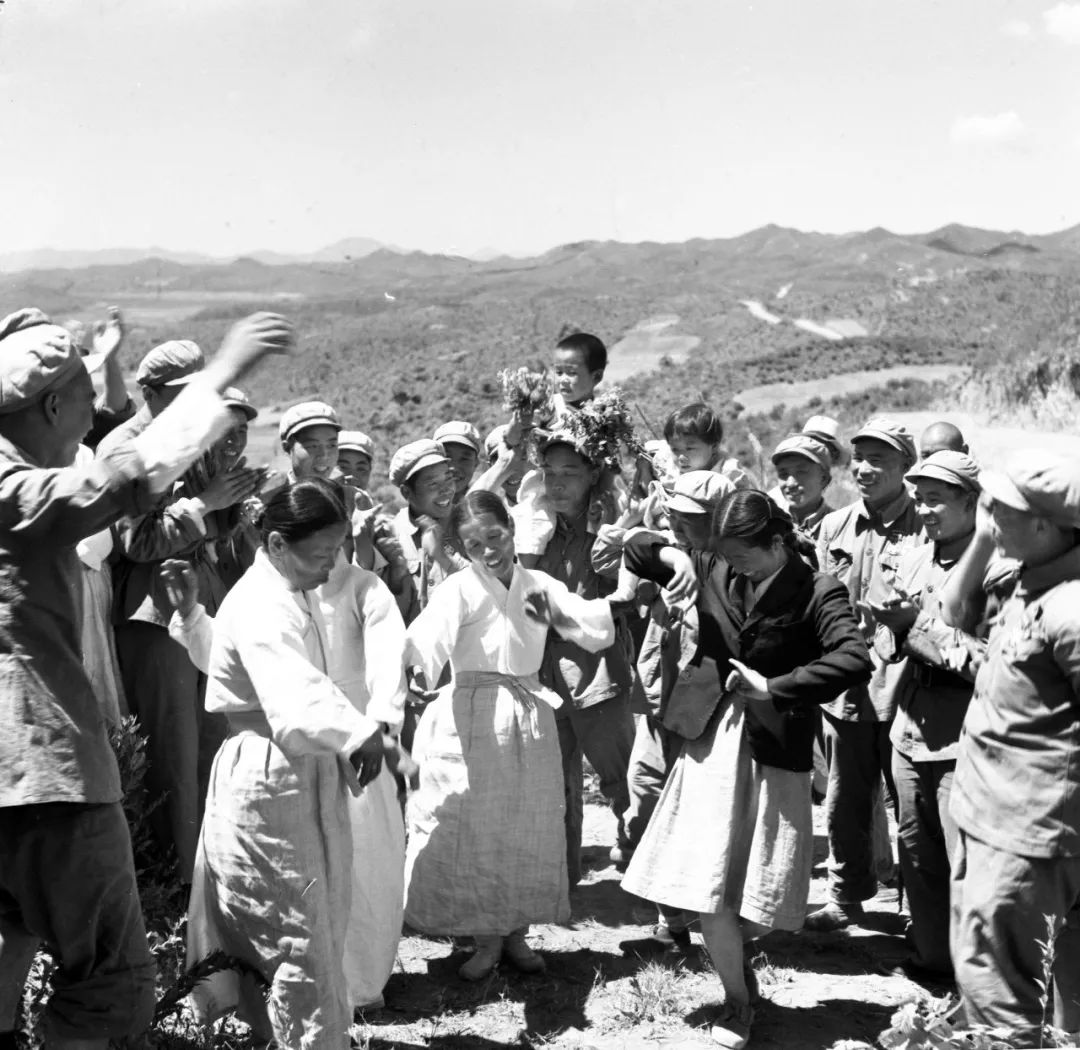 1952年6月,中国人民政治协商会议代表赴抗美援朝前线,向中国人民志愿军赠送纪念章。朝鲜百姓到阵地上祝贺志愿军战士们获得光荣称号