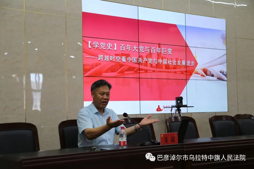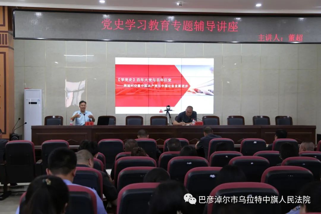 为庆祝建党100周年,深入推进党史学习教育,切实做到学史明理、学史增信、学史崇德、学史力行,6月30日上午,乌拉特中旗人民法院举办党史学习教育专题讲座,邀请旗委党校副校长董超老师以“百年大党与百年巨变——跨越时空看中国共产党与中国社会发展进步”为题,进行专题辅导讲座,法院全体领导班子成员、干警参加讲座。