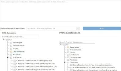 TeaPGDB全面收集、整理和注释已发表茶树基因组(包含叶绿体和线粒体基因组)文章中的基因组和蛋白质组数据,注释的结果包含基因家族鉴定、GO注释、KEGG注释、基因位置信息、基因和蛋白质序列、基因结构、信号肽预测等。当然,用户可以在检索界面输入gene id以获取对应的注释结果(图1)。研究人员如果以近期发表的高质量茶树基因组数据,如:‘舒茶早’(2020年)、‘黄旦’(2021年)基因组等作为参考基因组,此基因组注释结果将方便他们掌握所关注基因的详细信息,加快分子生物学研究进程。系统还提供了其他的在线工具,如BLAST、SSR search等。BLAST工具中含有拟南芥、水稻和已发表茶树基因组的茶树品种等较多植物的基因组、蛋白质、CDS序列作为参考数据库,用户使用BLAST工具可对未知序列进行比对分析,获得未知序列的同源序列,便于开展该序列功能预测和分析(图2)。SSR search工具包含茶树基因组中的简单重复序列,用户通过输入茶树染色体名称和序列在染色体中的起始和终止位置以及碱基序列,得到相应的SSR检索结果。TeaPGDB还包含茶叶风味基因页面(Tea flavor genes),收集和挖掘茶叶品质相关的成分:儿茶素、咖啡因、茶氨酸的生物合成基因,并提供这些基因的注释结果,以促进茶叶品质成分的分子机理研究。