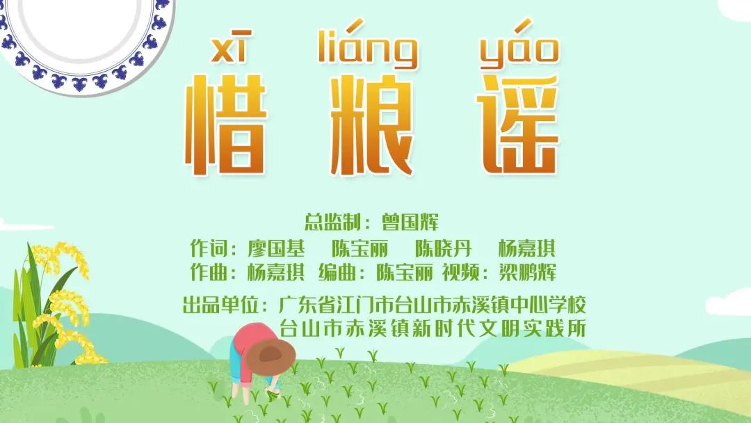 为致敬袁隆平院士,弘扬中华民族优秀文化和尊重劳动、珍惜粮食的传统美德。台山市赤溪镇中心学校根据本地实际,因地制宜,借助地方特色文化陶冶学生思想情操,弘扬客家人勤劳俭朴、刻苦上进、尊师重教、爱国爱乡的优良传统,打造富有地方特色的“赤溪教育品牌”,大力开展“珍惜粮食”主题宣传教育活动。为了让同学和老师更生动地体会到珍惜粮食的重要性,赤溪中心学校专门组织教师作词编曲,推出原创赤溪客家童谣《惜粮谣》音乐MV。