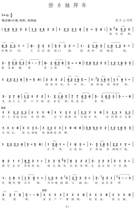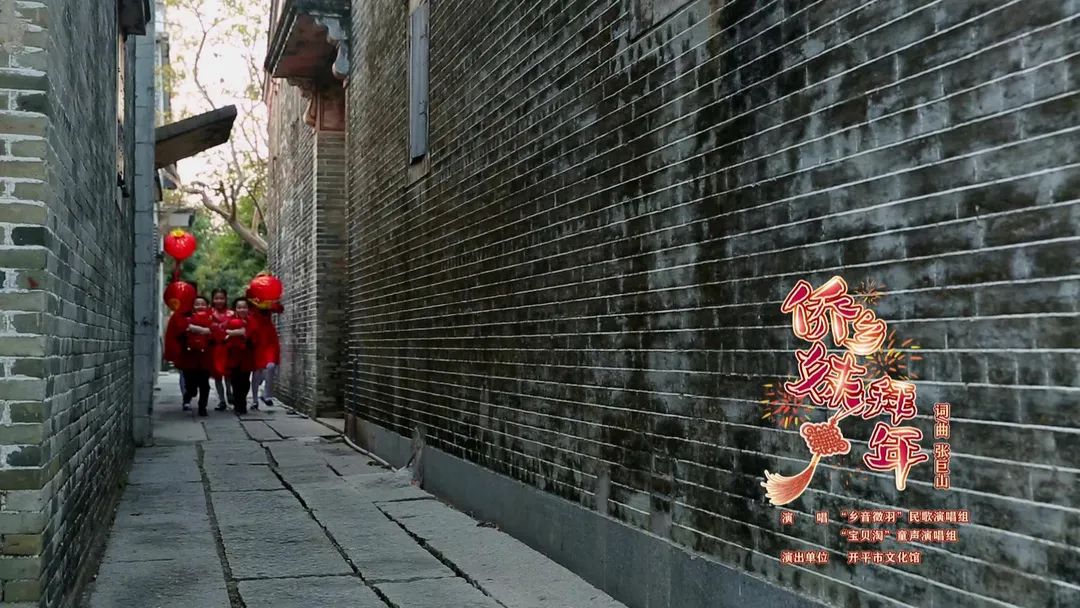 童谣《侨乡妹拜年》,讲述开平侨乡传统的春节习俗,歌词通俗易懂,融入了地方性的新年祝福以及新年必备的年货,演唱和说唱相结合,旋律欢快活泼,将侨乡的年俗烘托得淋漓尽致。勾起了五邑地区生活的人民对年的记忆,唤醒海外华侨的思乡之情,让他们记住乡愁。