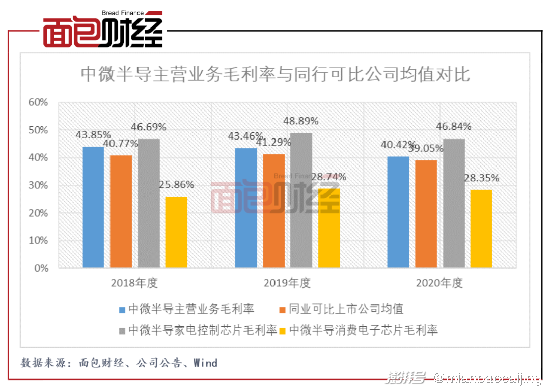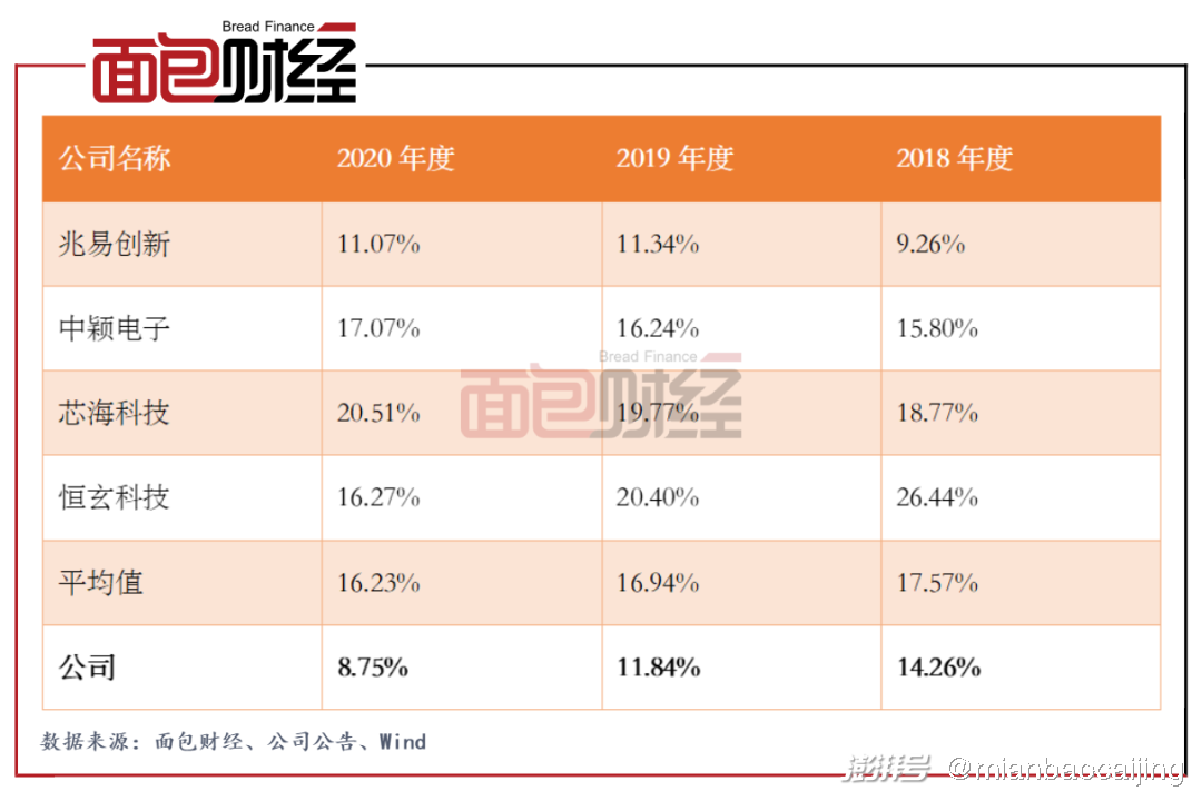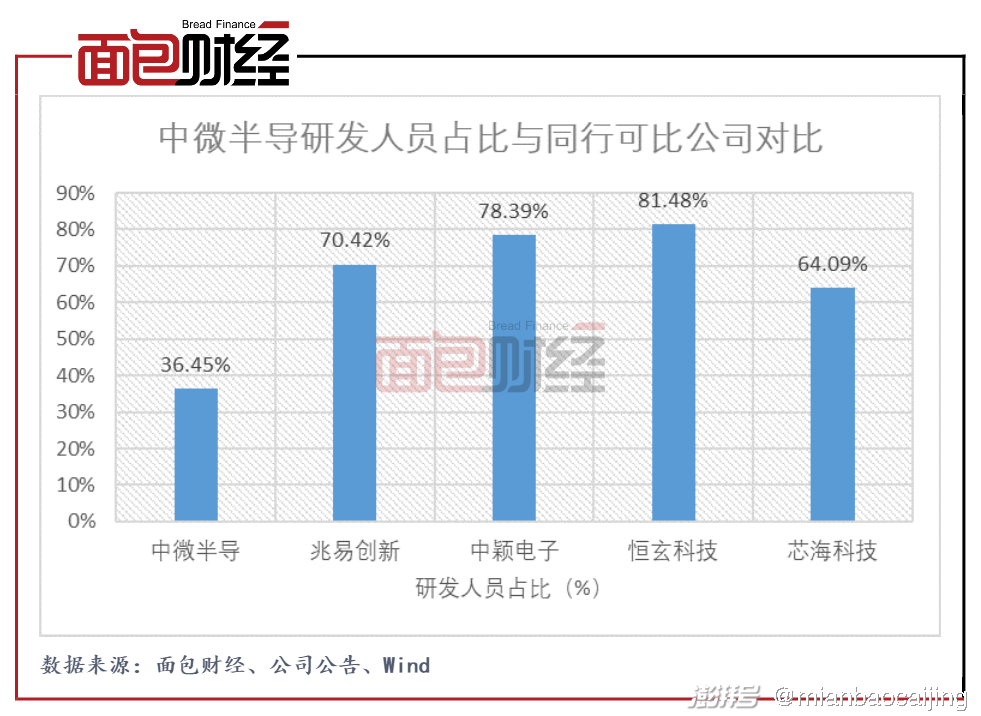 值得关注的是,中微半导的研发费用率低于同行可比公司。公司2018年至2020年的研发费用率分别为14.26%、11.84%和8.75%,同期可比公司研发费用率平均值分别为17.57%、16.94%和16.23%。