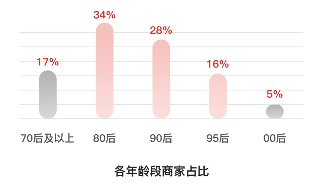 课题组在调研中发现,在拼多多平台上,80后商家目前仍然是电商经营的中坚力量,占全平台商家比例为34%,是70后商家的两倍以上。但90后、95后、00后等新青年商家店铺总占比已超过49%,且店铺交易总额增速超167%,生长力惊人,正在成为新崛起的主力军。