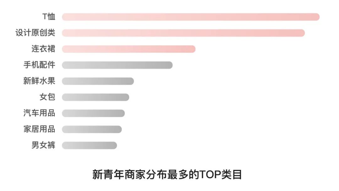 《报告》显示,新青年商家在拼多多平台分布最多的TOP类目,依次为设计原创类、女装T恤、连衣裙、男装T恤、手机配件、新鲜水果、女包、汽车用品、家居用品、男女裤装。可以看出,新青年商家类目与新青年消费者网购行为的需求基本匹配,集中于服饰、日用品、水果零食、潮流设计等与年轻人生活息息相关的消费领域。
