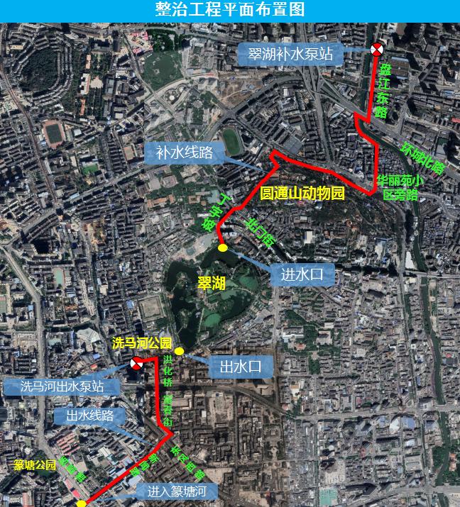12月8日,《翠湖周边历史文化片区整治提升规划》经云南省规委会审议通过,昆明市政府启动了“翠湖周边历史文化片区整治提升工程”,并将“翠湖补水泵站及补水管网改造工程和洗马河出水泵站及出水管线工程”列入一期示范项目中。解决翠湖水体能见度低、景观效果差、水体置换周期长,部分原有水生动植物无法生存,局部季节性暴发水体富营养化呈加重趋势的问题。