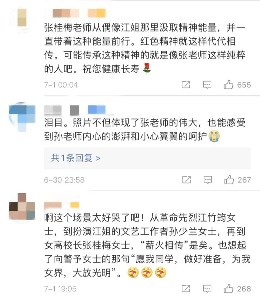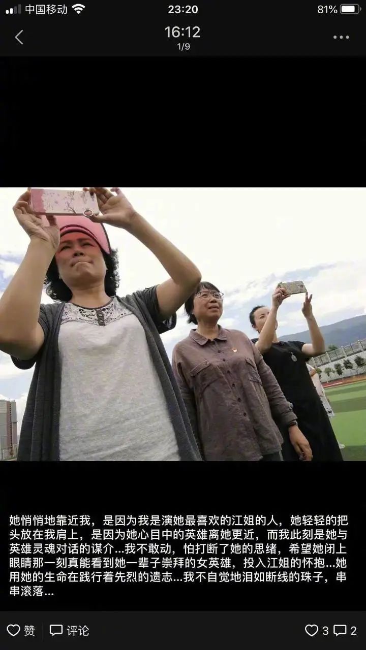 「她悄悄地靠近我,是因为我是演她最喜欢的江姐的人,她轻轻的把头放在我肩上,是因为她心目中的英雄离她更近,而我此刻是她与英雄灵魂对话的谋介…我不敢动,怕打断了她的思绪,希望她闭上眼睛那一刻真能看到她一辈子崇拜的女英雄,投入江姐的怀抱…她用她的生命在践行着先烈的遗志…我不自觉地泪如断线的珠子,串串滚落…」——孙少兰