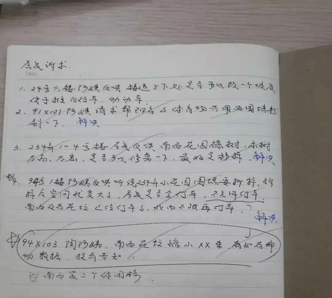 采访过程中,张静经常会在碰到居民后打招呼询问近来的生活,面对如此庞大的居民数量与遇到的问题,她有一个“法宝”——备忘录,里面记着密密麻麻各种各样的“疑难杂症”。“这里面都是居民来找我反映的问题,无论大小,我都会记在备忘录里,并将问题分类,解决一项就划掉一项。”如果遇到暂时无法解决的,她也会先跟居民解释清楚,再重点标记,以待未来解决。“她是我们小区里公认的‘女强人’,每次只要遇到难题来找书记,她都会记下来及时解决。”前来居委会咨询问题的李奶奶忍不住夸起了张静。