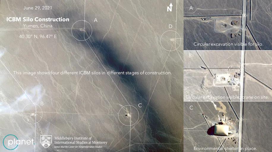 每个发射场与相邻的发射场之间相隔约两英里(约合3.2公里),许多发射场被一层巨大的圆顶状覆盖物所掩盖,中国其他地区已经施工的导弹发射井就是这种做法。在圆顶没有就位的地方,可以看到施工人员在沙漠地面上挖掘一个典型的圆形坑。马丁还表示,如果算上中国其他地区开工的设施,总约145导弹井施工。
