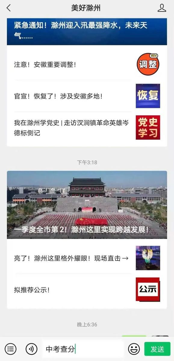 关注“美好滁州”微信公众号后,向美好滁州输入并发送“中考查分”,点击弹出的链接,即可进入查分系统进行查分。