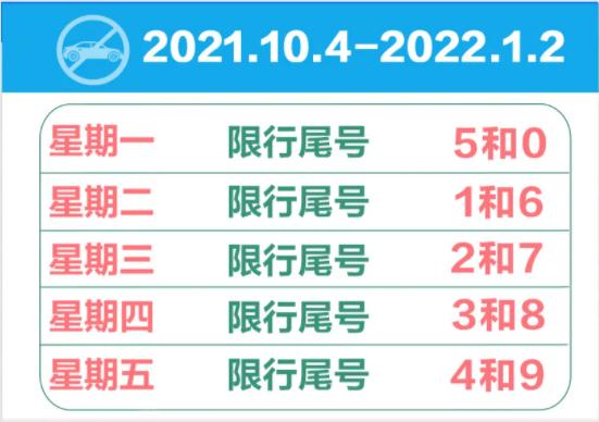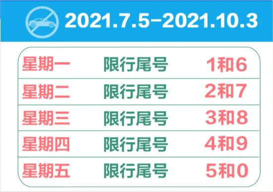 按照北京和天津实施的限行规定,2021年7月5日起,新一轮尾号限行即将开始。自2021年7月5日至2021年10月3日,星期一至星期五限行机动车号牌尾号分别为1和6、2和7、3和8、4和9、5和0。