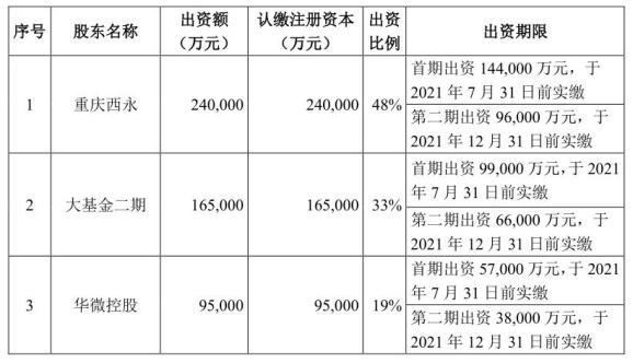 根据公告,重庆西永、国家大基金二期、华微控股分别出资24亿元、16.5亿元、9.5亿元,出资完成后分别占项目公司注册资本的48%、33%和19%。