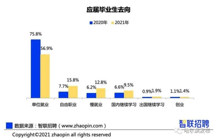 数据显示,2020 年和 2021 年应届毕业生在就业选择方面变化较大。选择事业单位、大厂等就业的毕业生人数,从 2020 年的占比 75.8% 下降到 2021 年的 56.9%。今年选择从事自由职业、慢就业、继续在国内深造的毕业生人数较 2020 年翻倍。