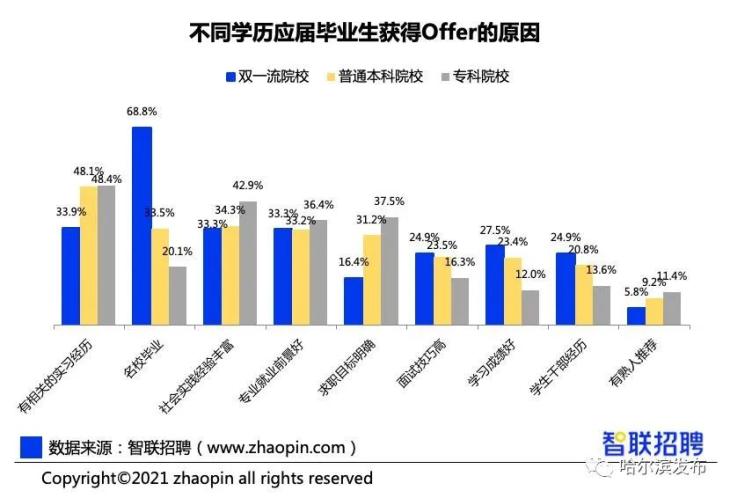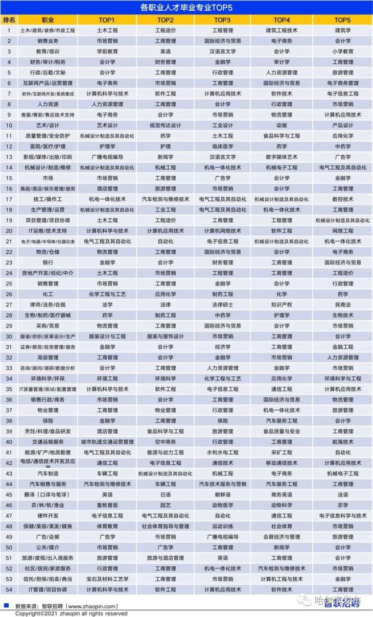 专业对口仍是市场供需匹配的主旋律。智联招聘对 2018-2020 年不同专业背景的毕业生当前从事职业的关联情况展开大数据分析发现,职业与专业的匹配度整体较高。除专业与就业契合度以外,就业弹性与专业的长期前景也值得观察。《2021 大学生就业力调研报告》数据显示,工学毕业生收获 Offer 占比最高,达 67.8%,其次是经管类(62.3%)。