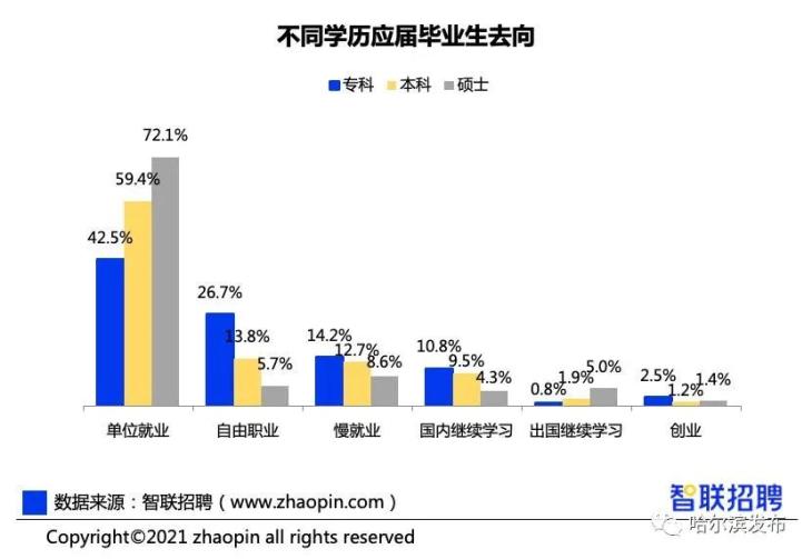 提高学历并不是专科生的唯一出路,智联招聘数据显示,作为应用型人才的专科生,在市场中的需求量较大。依托于专业技能和新就业形态,专科生在自由职业、慢就业以及创业上的选择均高于其他学历毕业生。实践经验、社会经验、专业前景好、目标明确,是专科学生的求职法宝。