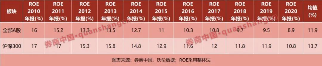A股的股东报酬率长期也在12%的水平。券商中国的统计数据也显示,从2010年至2020年过去十年间,A股整体法下的平均ROE是11.9%,沪深300的平均ROE为13.7%。目前中国十年期国债收益率为3.1%左右。