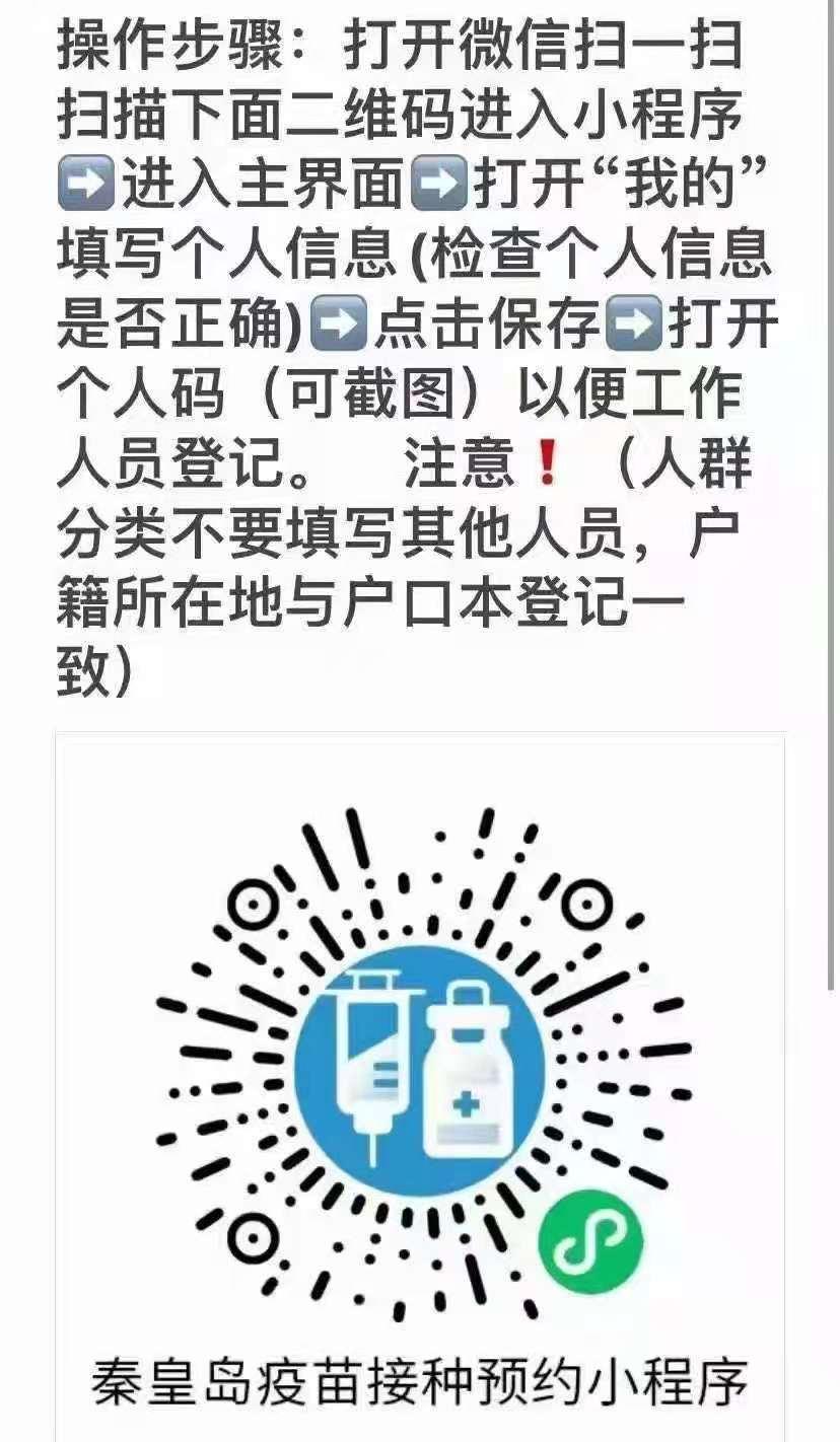 按照海港区防控办通知,我中心继续作为新冠疫苗接种点,疫苗种类为北京科兴及长春生物;第一剂次与第二剂次均可接种。请接种第一剂次人员携带身份证原件并扫描下方二维码进行注册,接种第二剂次请携带身份证原件及第一针接种凭证。