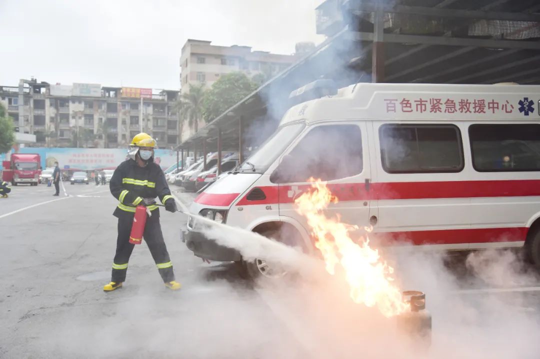 培训会结束后,保卫科科长罗捷组织医院医护人员开展“救护车起火救灾救治”消防安全演练、火灾逃生演练、灭火器使用演练,右江区消防救援大队专家参与指导,让广大职工进一步熟知消防安全知识,掌握发现安全隐患及时处理上报的步骤和处理方式,为深入创建平安医院,全面提高医院消防安全保障能力奠定良好的基础。