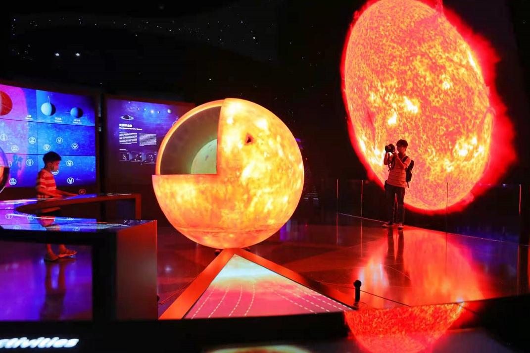 在这里,巨大的地球、月球和太阳出现在你的面前。外部直径20米的天象厅外层被投影成地球的形态,交替展现从太空中看地球的景象,以及反映地球45亿年地质演化史的短片;地球的旁边是巨大的月球模型,其大小与“大地球”的比例关系正是真实的地球和月球的比例关系,其表面特征则是根据嫦娥探月等航天探索获得的真实数据进行构建的,细节几可乱真;更远一些,一个巨大的投影屏展现的是太空卫星拍摄的日面物质抛射的壮观场景,带给观众对太阳不一样的理解。