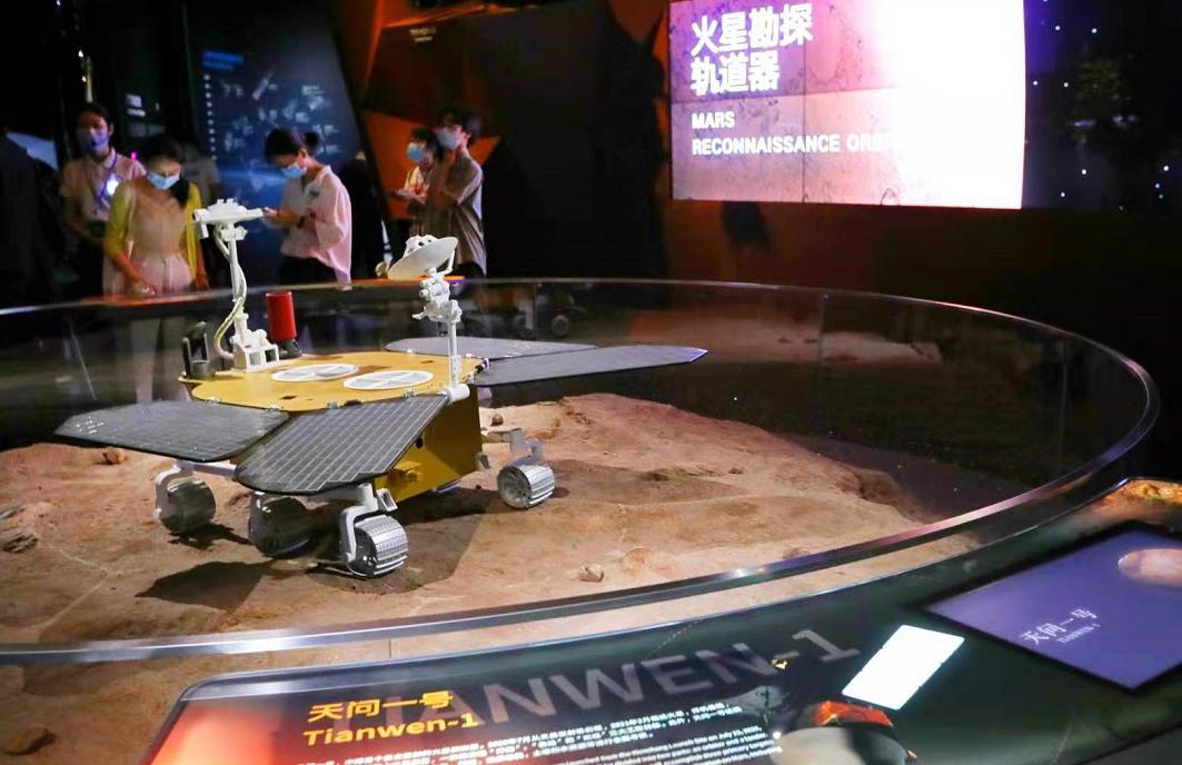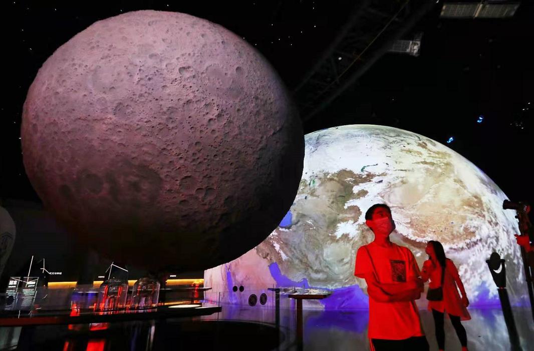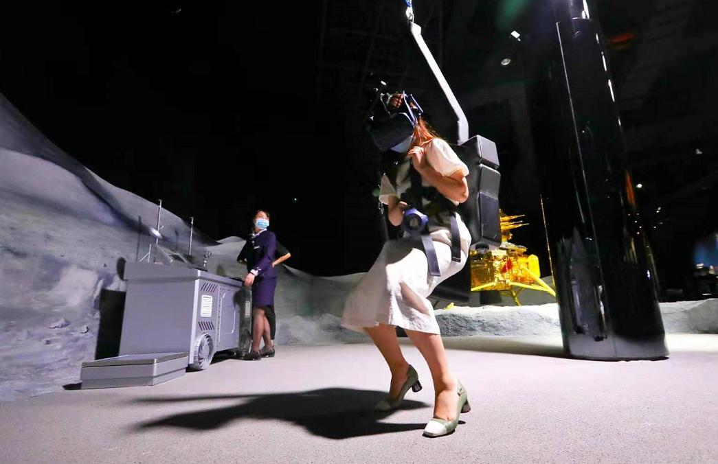 月球上的一晚相当于地球15天,玉兔号如何度过漫长黑夜?在“飞天”主题区,以1:1.5的比例,展现了嫦娥五号和玉兔号在月球上工作的动态场景。