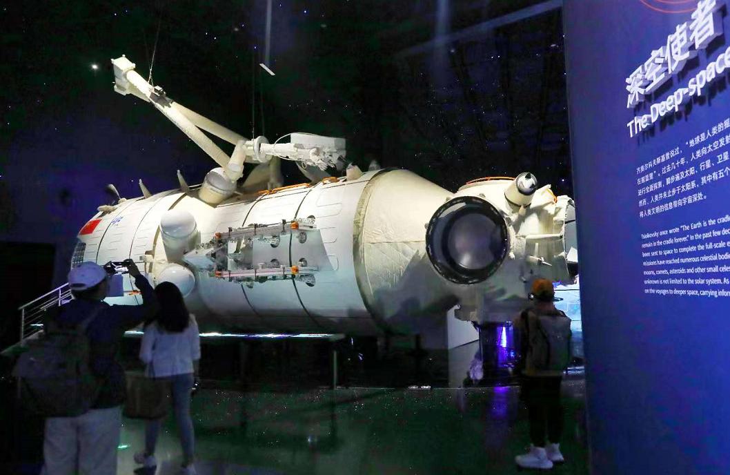 “天和号核心舱”这个庞然大物就是今年4月29日成功发射的天和号核心舱1:1仿真模型,同时完整的天宫号太空舱整体模型吊挂在头顶,演示与天舟号的交会对接。